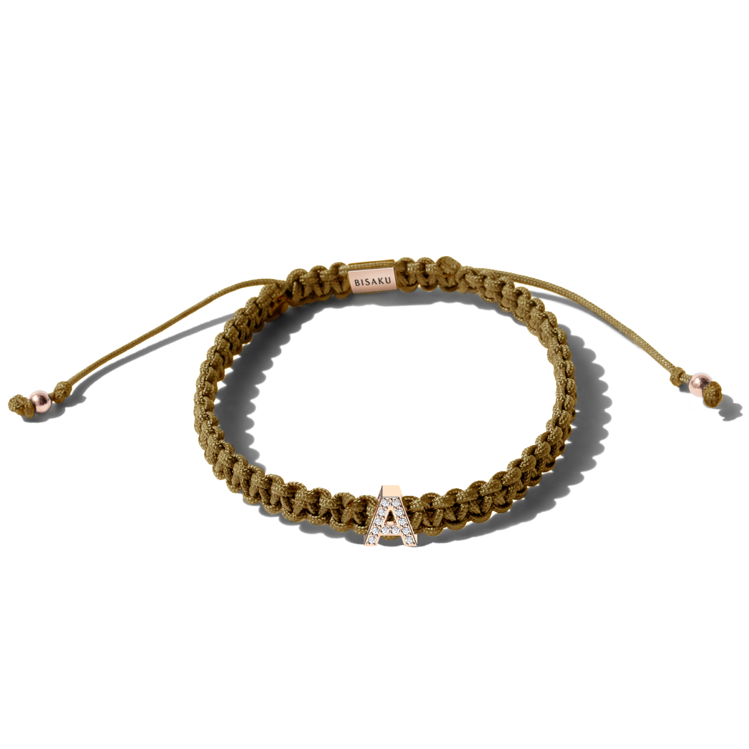 A hand-braided bracelet with a letter of your choice. A symbol of your personal story you can wear every day. The letter adorned with diamonds gives the piece a subtle sparkle and timeless character. Its minimalist style and adjustable size make it a perfect gift – even for yourself. Please note the color of gold you are interested in. (S131/A)