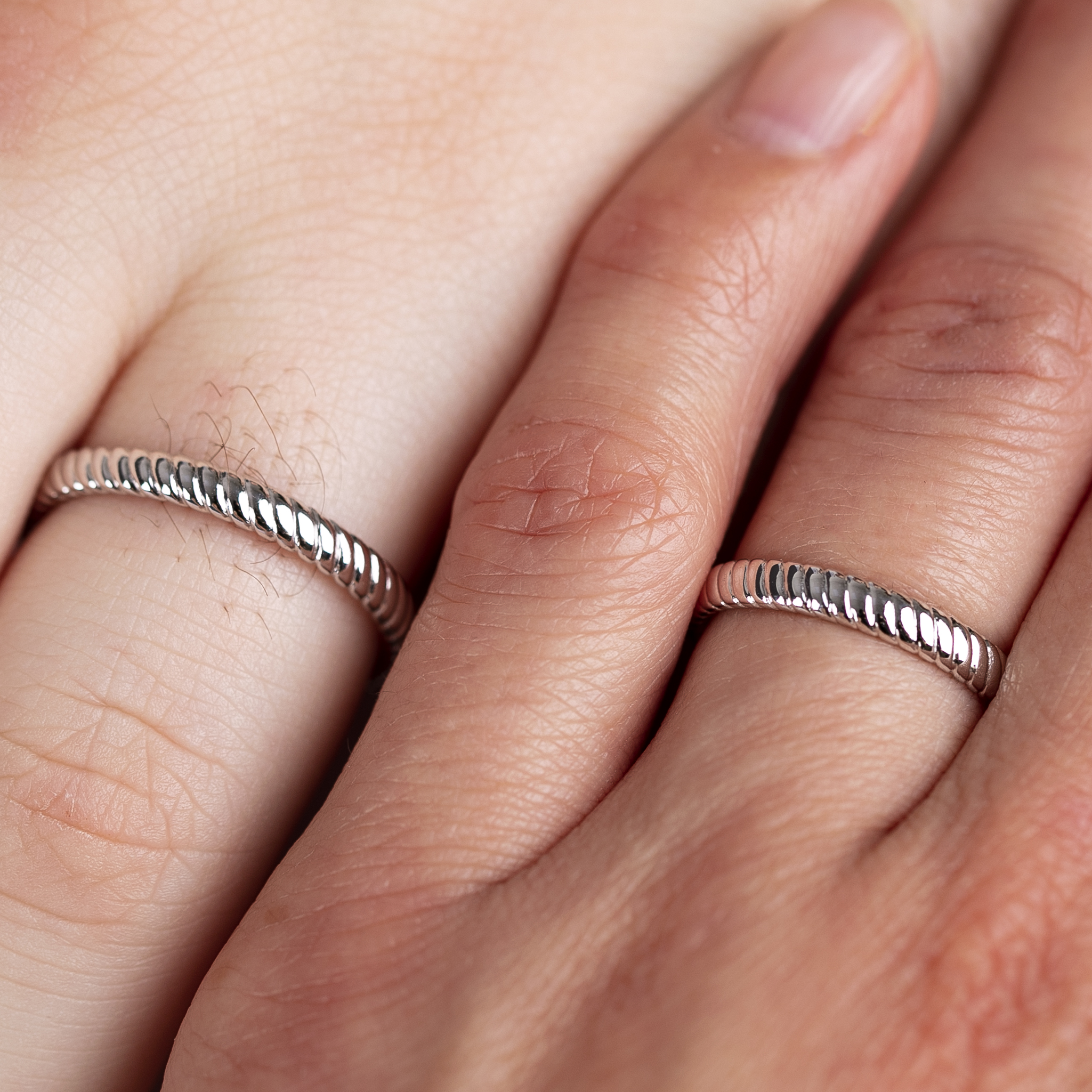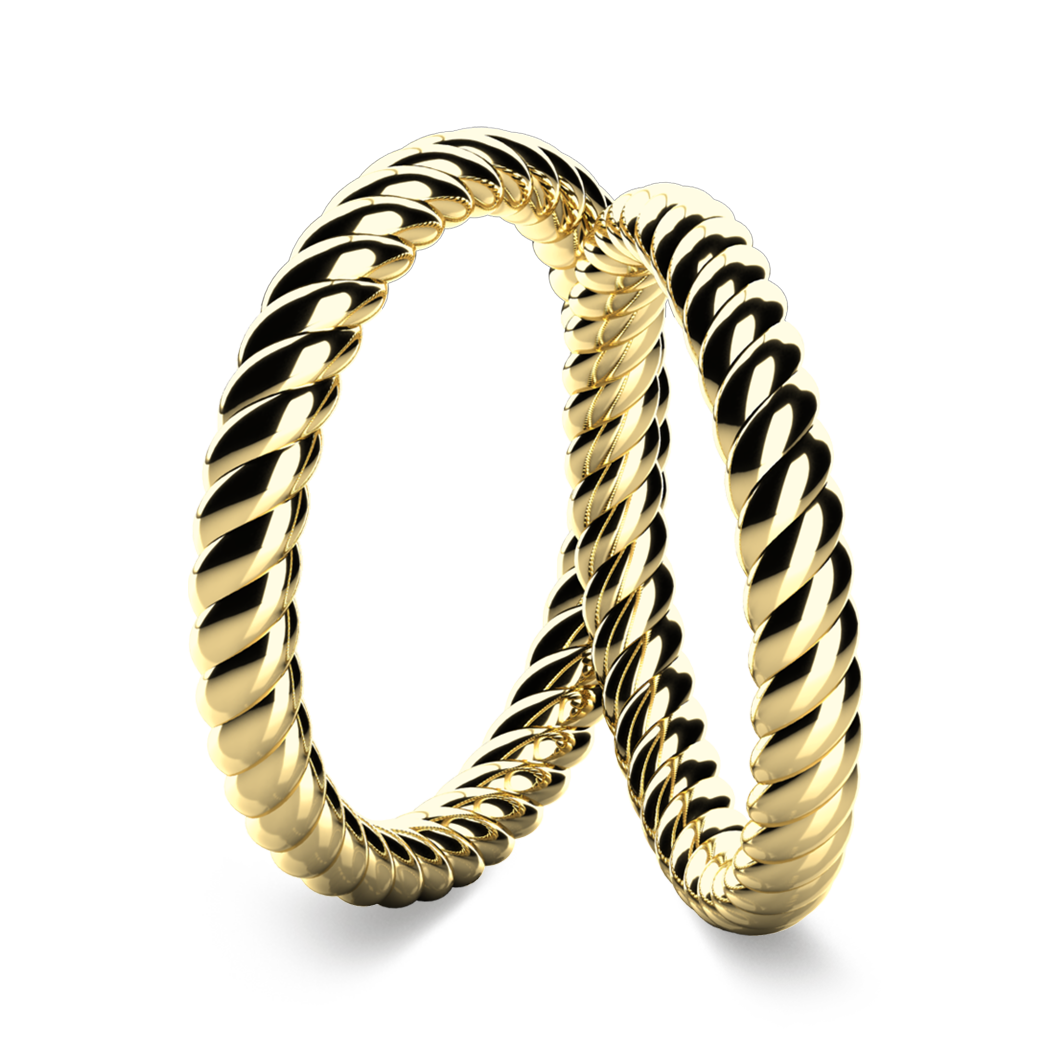 These narrower rings, which are identical in both men's and women's designs, are decorated with a delicate rope pattern, which signifies the stability and strength of your relationship.