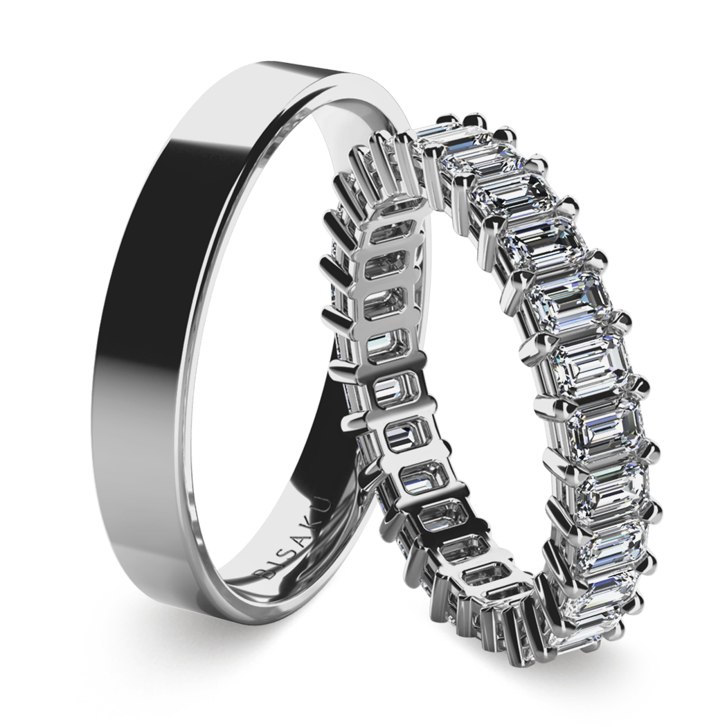 ALMAZ wedding ring set – the women’s eternity ring is set all around with emerald-cut stones that create an unmistakable sparkle. The men’s ring features a clean, polished design that emphasizes the contrast and harmony of the pair.